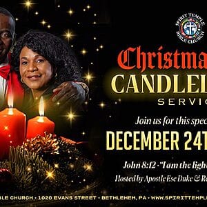 STBC’s Christmas Eve Candlelight Service Celebrate the joy, hope, and love of the Christmas season with us at our Christmas Candlelight Service, hosted by Apostle Ese Duke and Rev. Gladys Duke. Join Us for a Celebration of Our Lord & Savior Jesus Christ 📍 Venue: Spirit Temple Bible Church 1020 Evans Street, Bethlehem, PA […]